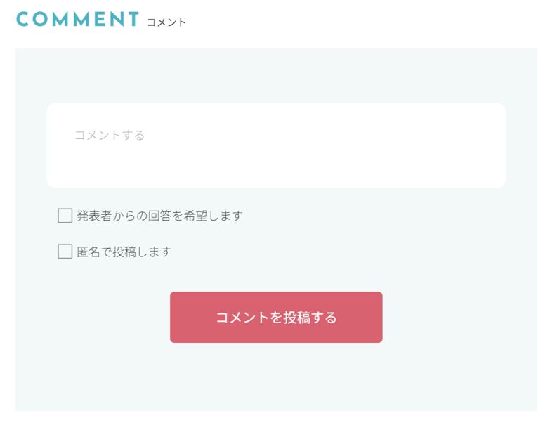 - 各コンテンツ記事に対して、コメントを投稿することができます。コメントを投稿する際には「発表者からの回答を希望します」「匿名で投稿します」にそれぞれチェックを入れることができます。