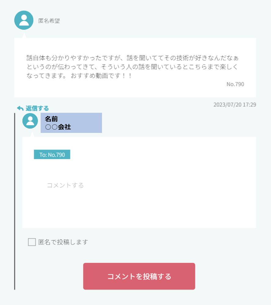 - 各コメントに対しては、返信を投稿することもできます。各コメント下部にある「返信する」をクリックすると、返信コメント用のフォームが表示され、当該コメントに対して返信を投稿することができます。