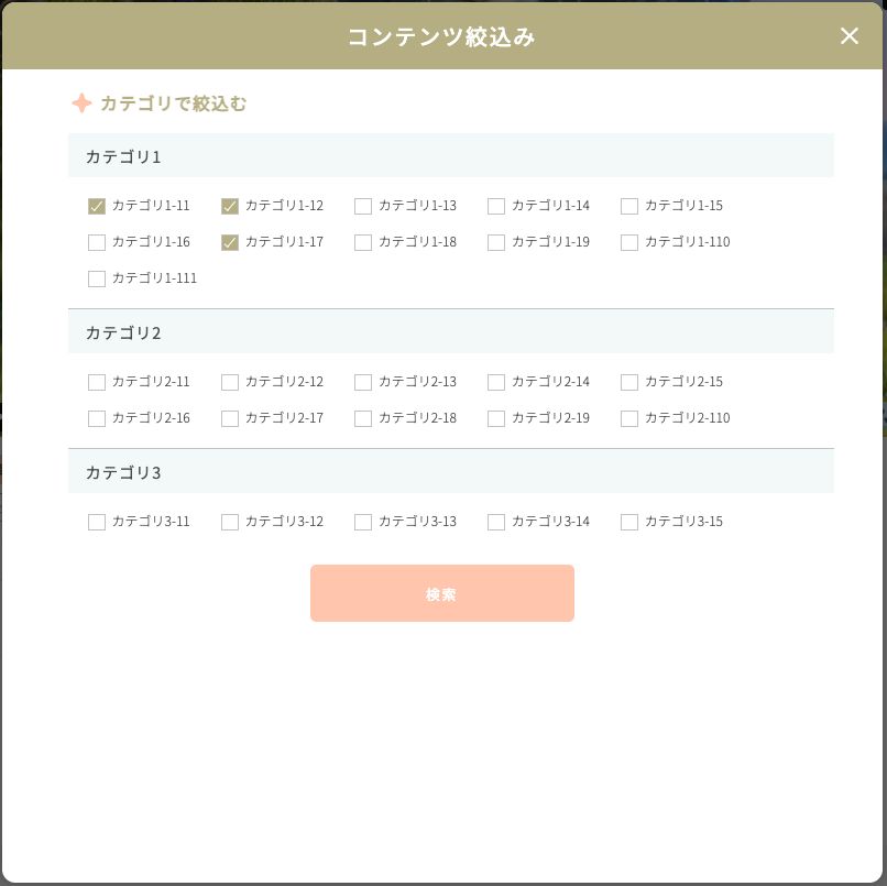 - 検索したい条件を選択後、画面下部の「検索」ボタンをクリックすると、選択された条件で絞り込まれた記事コンテンツ一覧画面に遷移します。