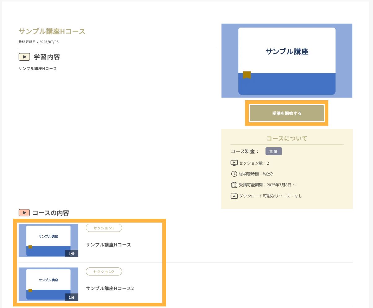 - コース画面の「受講を開始する」ボタンをクリック、または「コースの内容」より視聴したいセクションをクリックしてください。