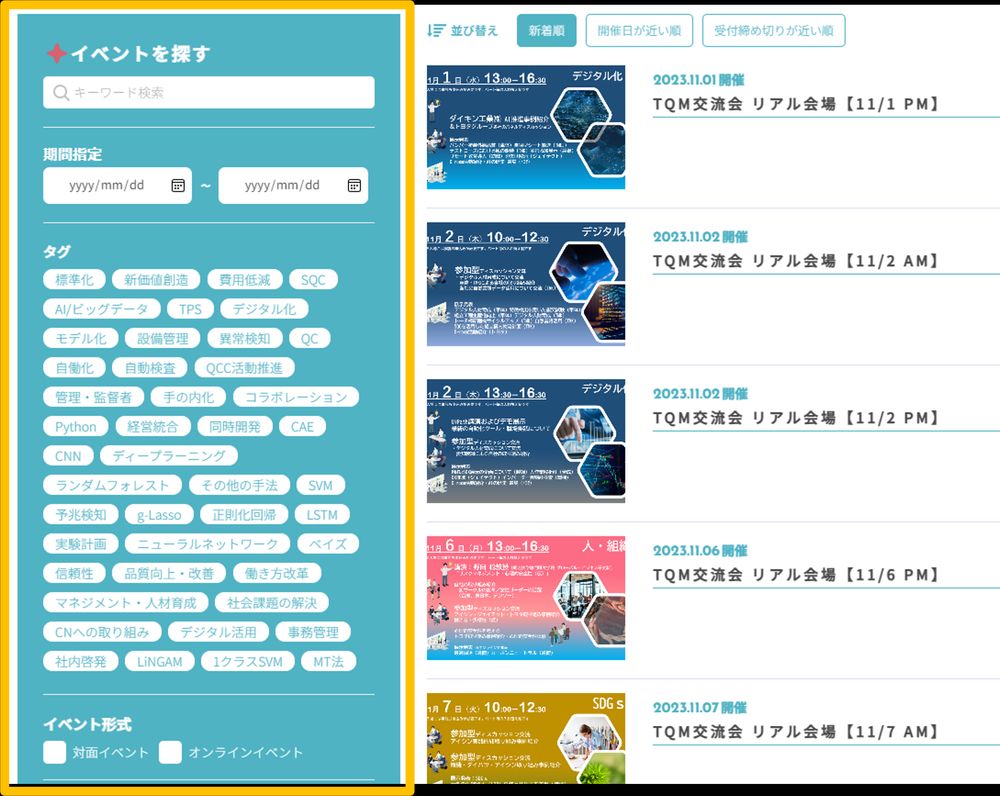 - キーワードや期間指定、タグといった様々な絞り込み方法で、イベントを検索いただけます。