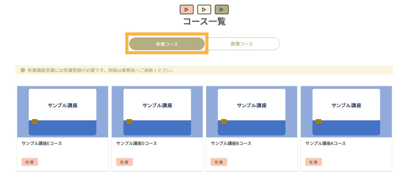 - TOP画面上の「コース一覧」の「有償コース」をクリックすることで、有償講座の一覧が表示されます。