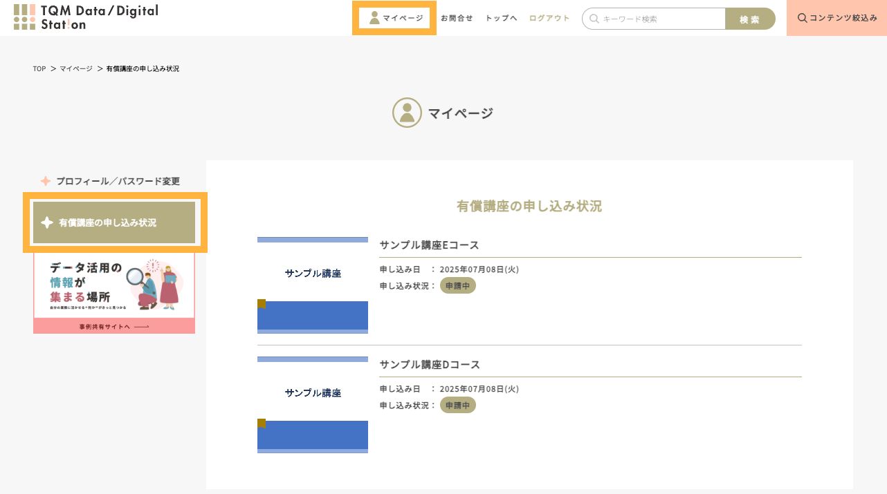 - 申し込みした有償講座は、ヘッダーにある「マイページ」→「有償講座の申し込み状況」からご確認いただけます。