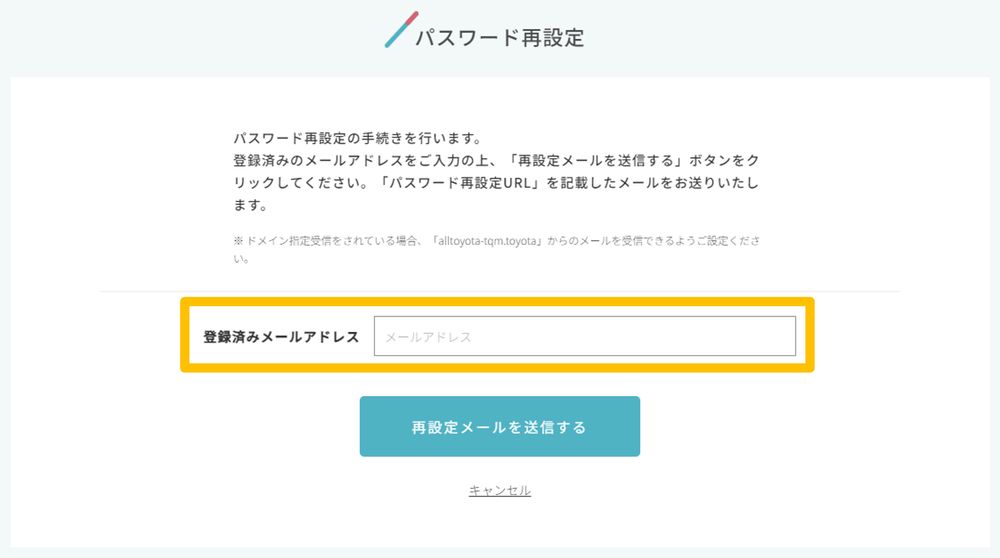 - 登録済みのメールアドレスを正しく入力し、「再設定メールを送信する」をクリックしてください。(ドメイン指定受信をされている場合、「alltoyota-tqm.toyota」からのメールを受信できるようご設定ください。)