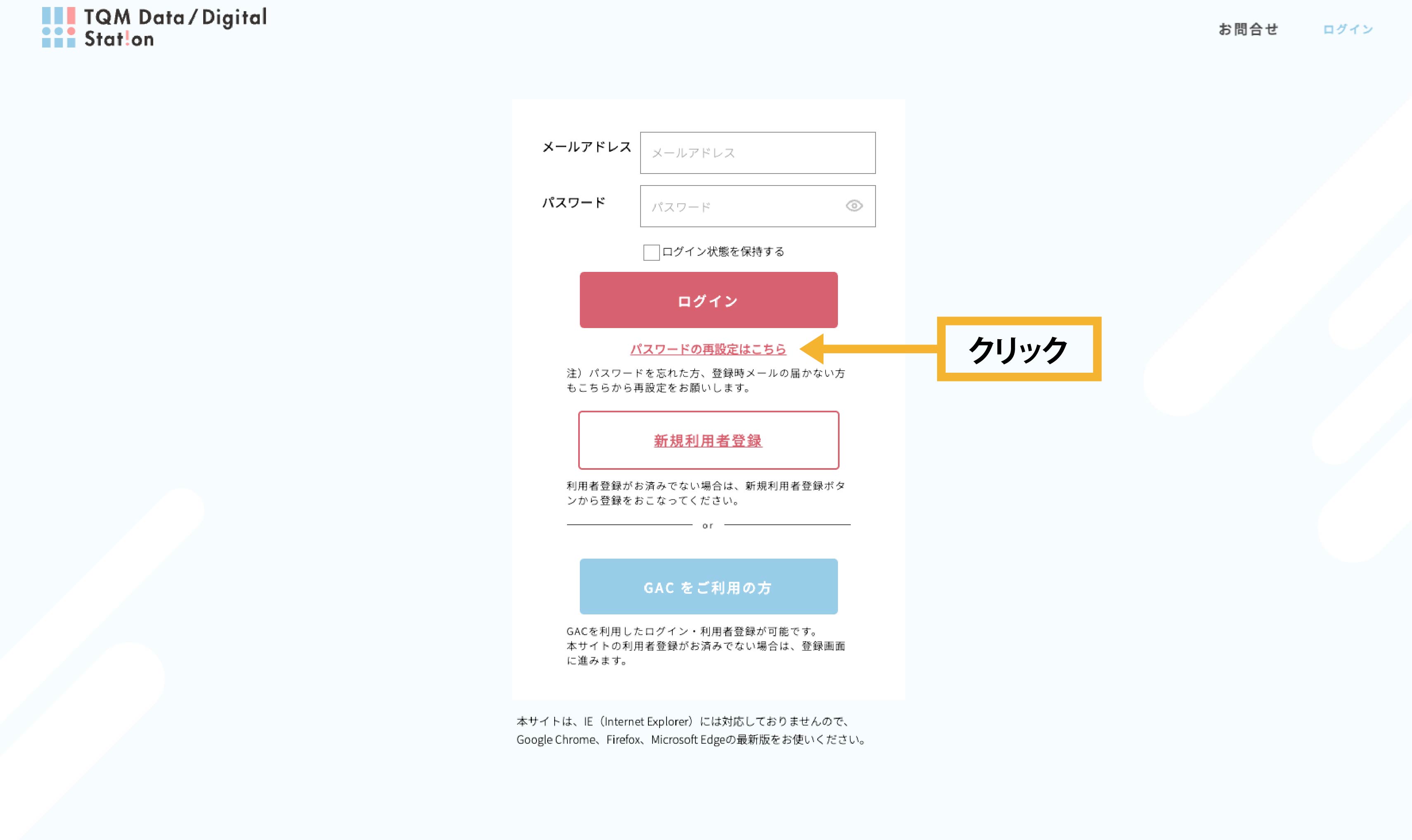 - メールアドレスが正常に入力された場合、当該メールアドレスに対して「【TQM Data/Digital Station】パスワードの再設定」という件名のメールが自動で送信されます。メール本文中のURLをクリックいただき、新しいパスワードを入力してください。