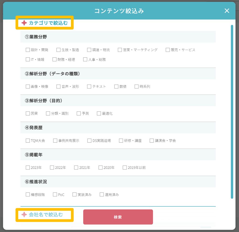 - コンテンツ絞込みをクリックすると、カテゴリ・会社による絞り込みを行うことができます。