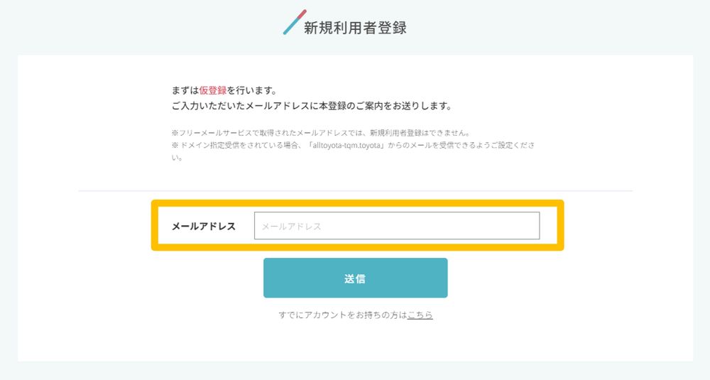 - メールアドレスを正しく入力し、送信ボタンをクリックしてください。(ドメイン指定受信をされている場合、「alltoyota-tqm.toyota」からのメールを受信できるようご設定ください。)