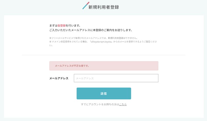 - メールアドレスが正しく入力されていない場合(例えばメールアドレス形式になっていない等)、「メールアドレスが不正な値です。」というメッセージが表示されますので、入力されたメールアドレスが正しいかどうかご確認いただき、それでも解決しない場合はお問い合わせください。