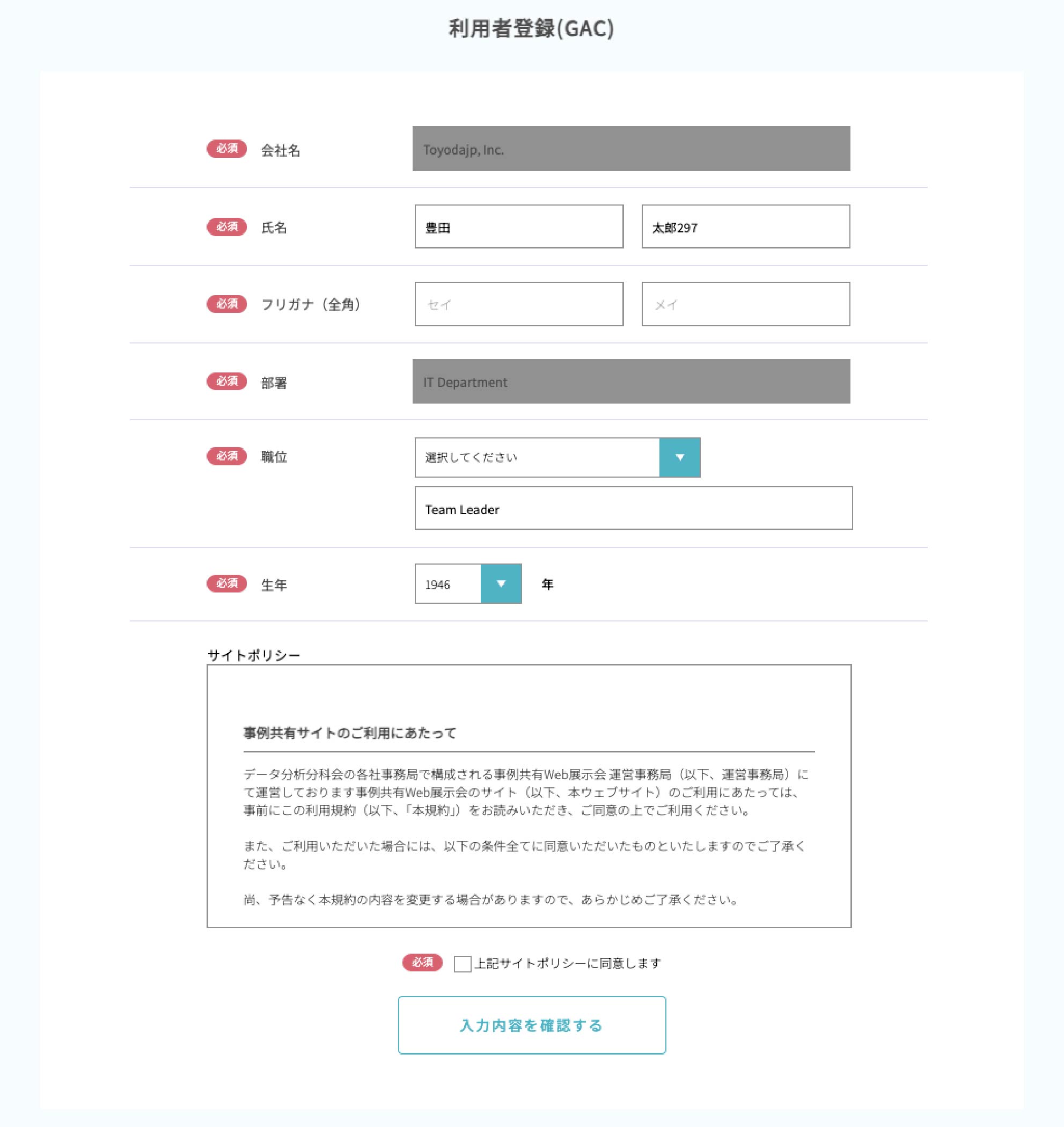 - GACに登録してある内容はあらかじめ入力された状態で表示されます。会社名、部署名は変更できません。氏名および職位は必要に応じて変更することが可能です。