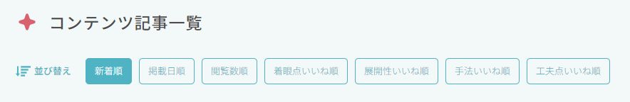 - TOP画面上にコンテンツ記事一覧が表示されますが、新着順、掲載日順、閲覧数順・・・をそれぞれクリックすると、コンテンツ記事の並び替えが可能です。